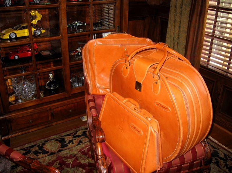 3 piece luggage set that came with the car, document and pouch, and a display of the tools and accessories on the lawn at Cavallino