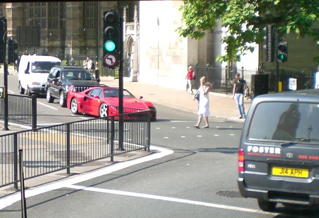 I snapped this photograph of a Ferrari F40 near the Palace of Westminster while visiting London in June of 2006, and have always been curious about it. The car appears to have the wheels and wing of an LM, and surprisingly was cruising through Westminster with light damage to the front end. It had a cracked and broken lower bumper, and the left head light as well as the front lip were being held in place with what looked like black duct tape. This is the only photo I was able to get of the car and I didn't see the rear end to verify if it was an LM. I was hoping someone could shine some light on which variant of F40 this is and perhaps the odd situation of disrepair it was in.