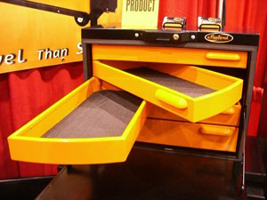 A tool box is a seemingly simple device, but here's a new twist. The drawers are pivoted on one side so they swing from the case like a door. The swivel joints have grease fittings so they're easy to service and this design permits access to several drawers simultaneously. Plus there's a sealed cover that keeps dust from finding its way inside.