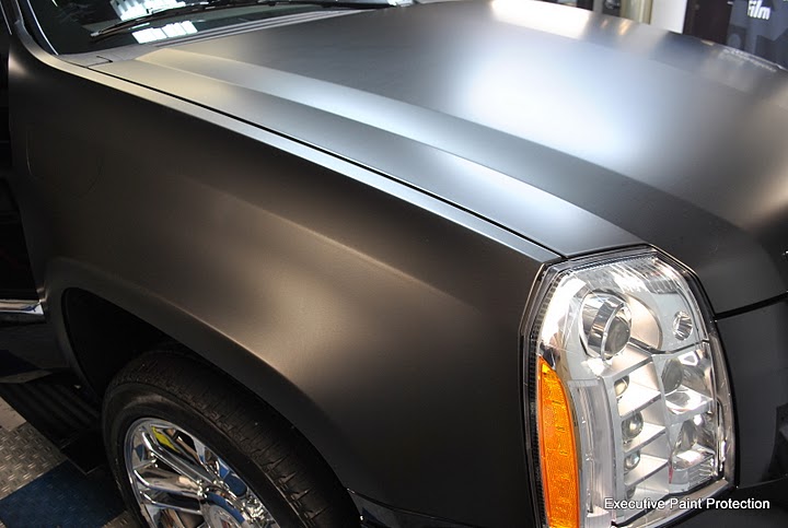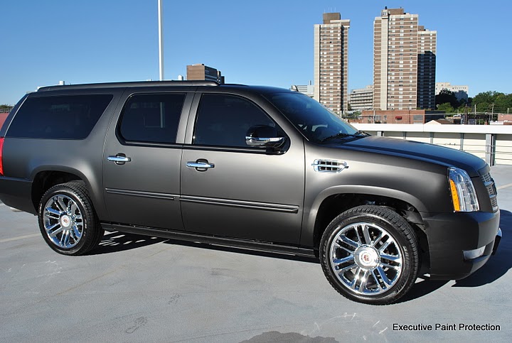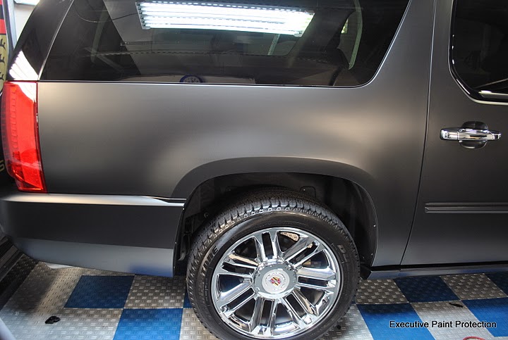 UPDATED PICTURES- Here is a 2011 Cadillac Escalade Platinum edition that we did a complete color change to Matte Black using 3M High Performance vinyl. This was a tremendous job but the results came out excellent. This Cadillac was completely washed and clayed to make sure the surfaces were free of contaminants prior to wrapping. We removed all the badges and proceeded to remove all door handles and mirrors. Once stripped down the Escalade was wrapped with large single pieces to make sure there were absolutely no seams. Here are some pictures and a link to the rest of the installation. Picasa Web Albums - Executive Paint P... - Matte Vinyl W...