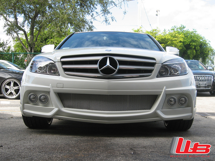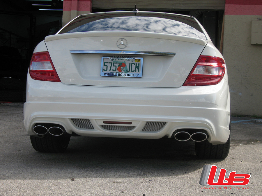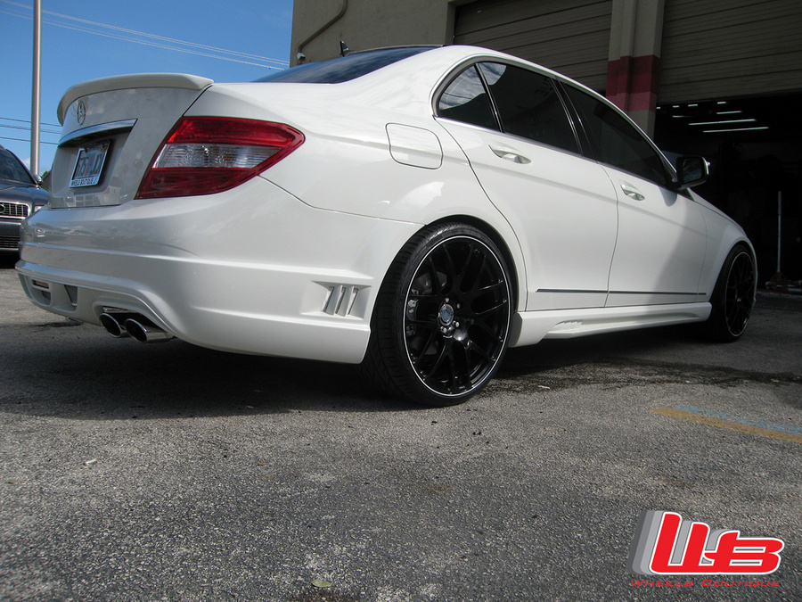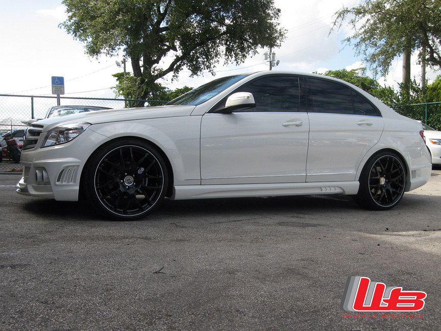 Here are a few pictures of a C-class we did with 20" HRE M40 in Gloss Black with a White Pinstripe and H&R springs. We also installed the Wald Black Bison front bumper, rear bumper and side skirts.