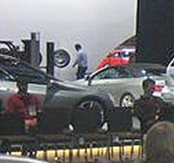 This pic is from the show floor a few hours ago. Can anyone identify the car to the left? ( you can see a grey car, big wheels, black roof, and a strange elongated area before the mirror )
