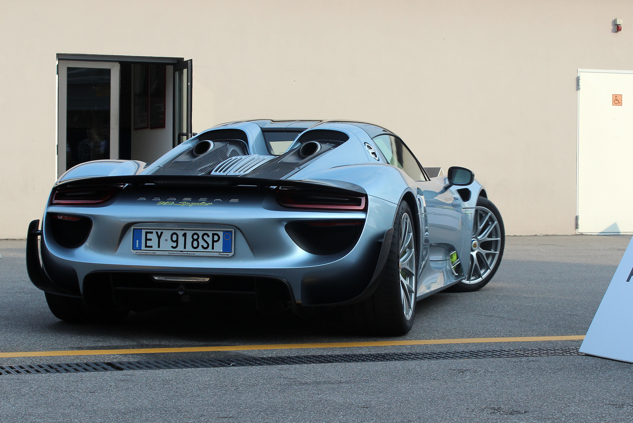 Scary Porsche 918 donut in a tight space almost hitting curb