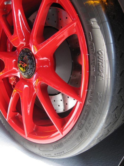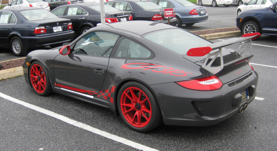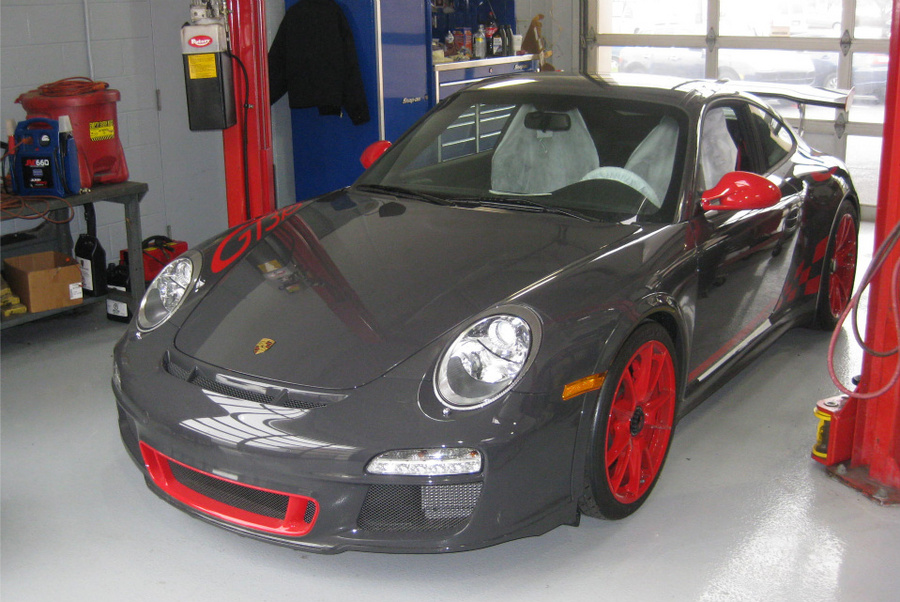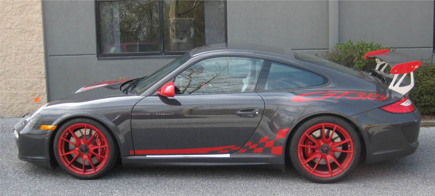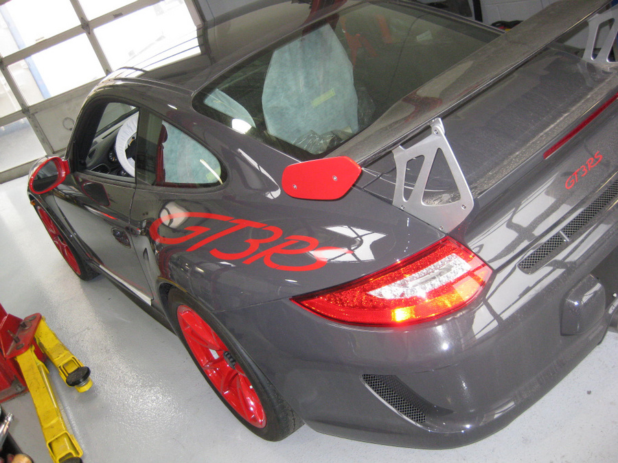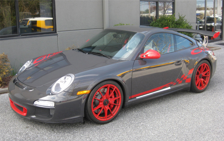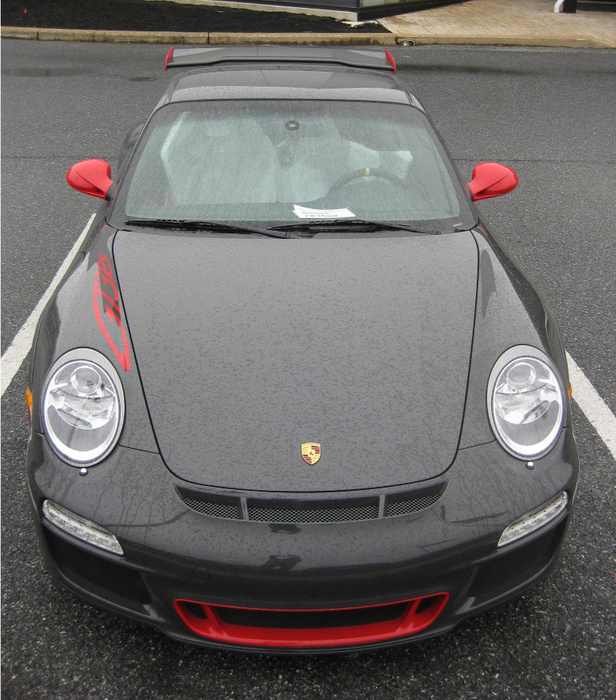 Drove 6 hours from Boston to Delaware to be at the dealer for 8am PDI. Lot's of congratulations from the tech and salespeople as well as obligatory cell phone cameras all around. What can I say; the car looks incredible in person and I'm 110% satisfied with my color choice (Grey Black/Red with full decals). I'd encourage anyone on the fence about the graphics to leave them on and reserve judgment until you see the car in the flesh. Interior is fantastic (full leather) and I'm very happy I went with the thicker steering wheel. It's not nearly as thick as the few photos floating around - mine included - make it appear and it fits my hands great. In fact it was so much less thick than I anticipated that I initially thought it was the wrong wheel. The dealer had a standard GT3 - get this, paid and registered by a customer three months earlier but never driven - sitting on the lot and a quick comparison confirmed that I did have the thicker wheel. And for those that saw my earlier post, it does have the black spokes as opposed to silver. Now standard spec or so I'm told. The standard seats are very nice but I still prefer the CGT seats for my tall slim frame. Perhaps an upgrade in the future.