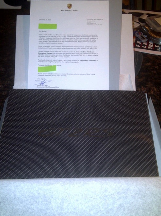 Letter basically invites me to two nights stay at the Breakers in Palm Beach, FLA. A day at the track with Porsche Instructors and a special gift from the event. The letter also provides a PIN number for access to an owners microsite.