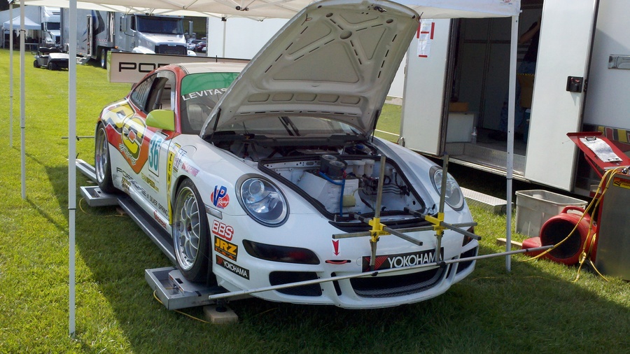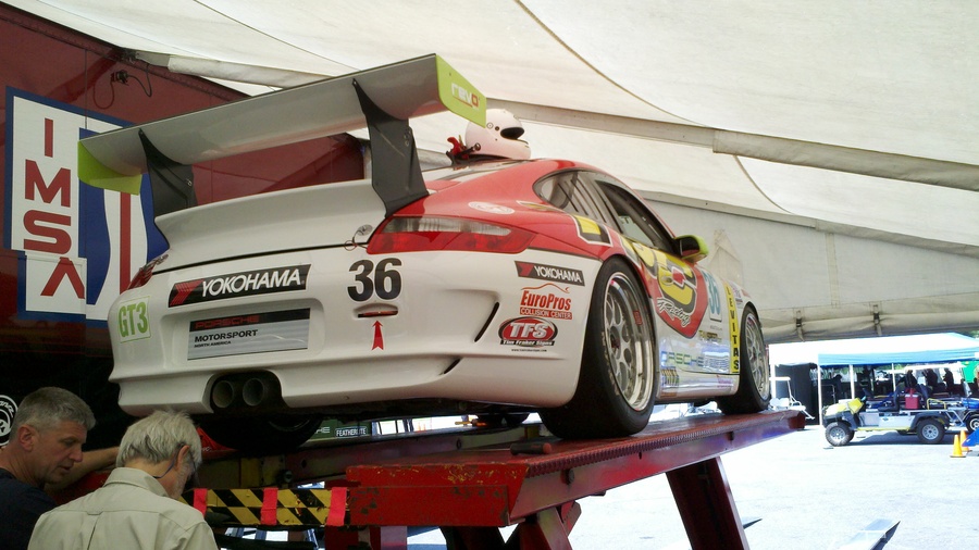 Since ALMS and the Cooper Tire Series cars are all running and Lime Rock does not allow cars on track on Sunday, the track time available is very limited. The tractor trailer got to the track yesterday and we unloaded this morning. Right when we unloaded, the car went straight to the setup pad. We did not have track time today so we spend all day working on the setup of the car and also in tech.