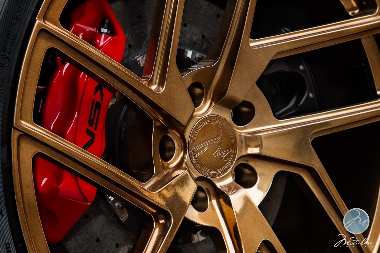 Modulare Wheels recently had the opportunity to build a set of wheels that would compliment the modern lines of this 2017 Acura NSX. After some discussion, the car owner agreed that the B38 Forged Monoblock wheel, with its true directional design and concave profile, was the perfect match. We got to work and built the wheels as 20x9.5 front and 21x12 rear for that perfect fitment and finished them in our special Polished Rose Gold finish to give the wheels just the right amount of pop against the OEM Casino White Pearl paint. The wheels were subsequently wrapped in 255/30/20 and 325/25/21 Pirelli P Zero rubber to put all that power to the ground. The vehicle also received a lowering kit from our friends at Science of Speed, to achieve that perfect stance.