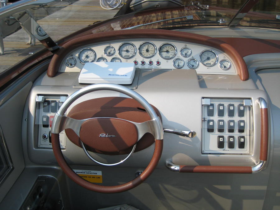 Thanks guys. I've had the boat since Dec '05. The Northstar GPS is OEM Riva. They redesigned the dash slightly for the '06 model year and moved it above the steering wheel (easier to read when underway). It used to be to the right of the steering wheel behind the shifters/throttles. I agree it looks crappy, but it's not so bad with the cover off. The boat is fiberglass with wood (mahogany) veneer/overlay on the deck, toe rail, transom, etc. I visited the factory in Sarnico, Italy in '05. Totally "old world". IMO, Riva's craftsmanship is the best in the world.