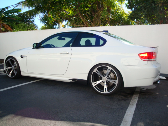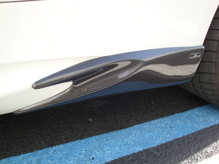 Here are some pictures of the new carbon fiber side skirt elements for the E92 M3. These parts are available in glossy carbon fiber (pictured), matte carbon fiber, and pu-rim. The side elements add a distinct look to the rear quarter of the vehicle and continue the widening effect of the original side skirts. It channels the air traveling on the side of the vehicle out and around the rear wheels while smoothing the airflow path. The carbon fiber versions are extremely light, weighing only .3 lbs a piece and match the factory 1 x 1 weave of the M3 roof. Fit and finish is perfect. Enjoy!