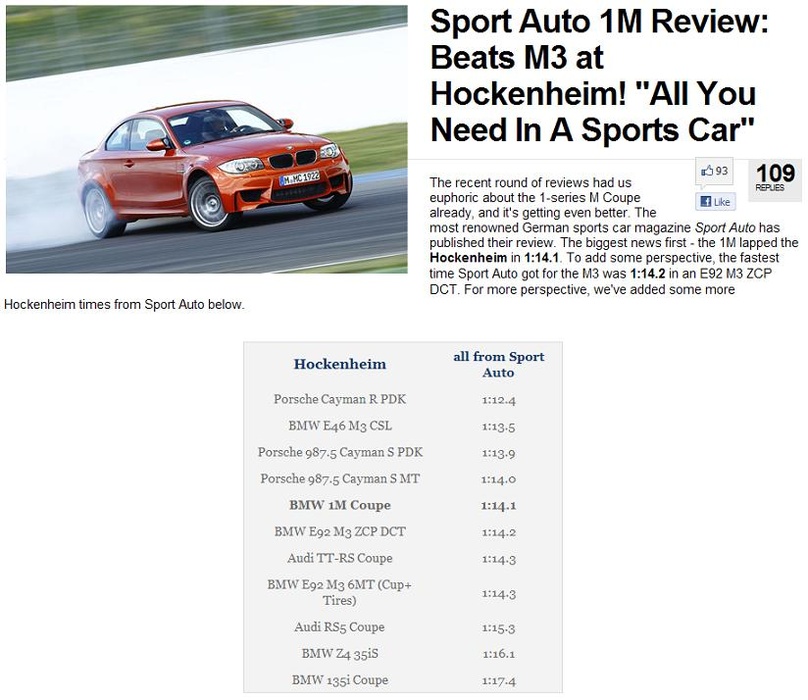 The recent round of reviews had us euphoric about the 1-series M Coupe already, and it's getting even better. The most renowned German sports car magazine Sport Auto has published their review. The biggest news first - the 1M lapped the Hockenheim in 1:14.1. To add some perspective, the fastest time Sport Auto got for the M3 was 1:14.2 in an E92 M3 ZCP DCT. For more perspective, we've added some more Hockenheim times from Sport Auto below.