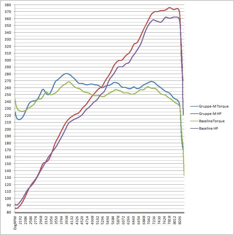"Here's the dyno results for 2008 BMW M3 and Gruppe-M Cold Air Intake on 91 octane gas. The baseline is the same motor with Evo Sport Power Pulley.
