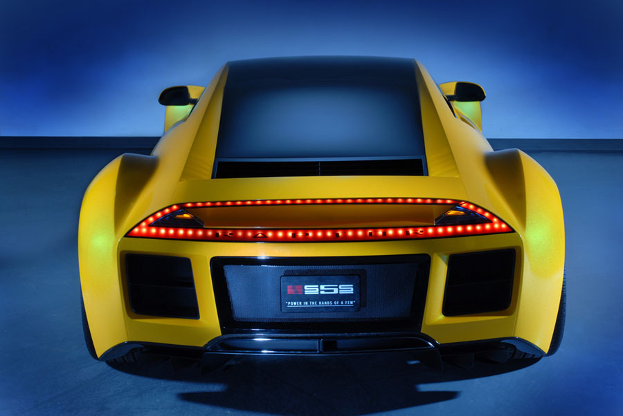 The concept carries the name S5S Raptor and it features a mid-mounted supercharged 5.0L V8 engine that can burn either petrol or 85% ethanol blended fuels. This engine develops a massive 650hp and 630 lb-ft of torque. The sprint to 60mph takes just 3.2 seconds and top speed is an estimated 200mph.