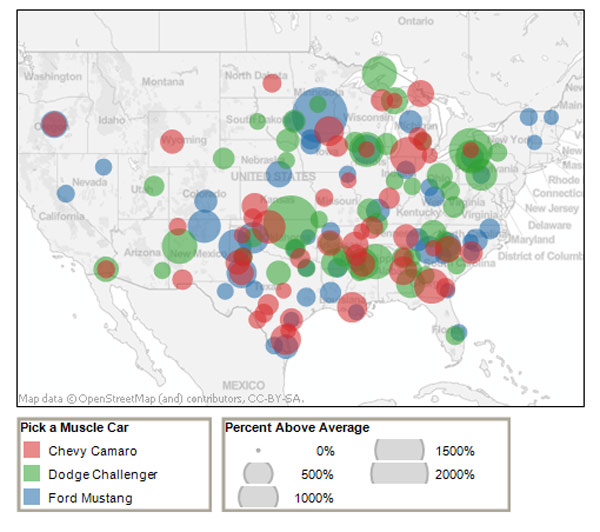 "The muscle car war is raging, with the Chevrolet Camaro and Ford Mustang jockeying for the title of top pony car. The Dodge Challenger is no slouch either, with a pair of new engines rumored for the 2011 model year. Our friends over at Cars.com are celebrating the recent success of America's reborn pony cars with an extremely neat interactive map that illustrates the towns most interested in a particular vehicle. The color-coded map differentiates the models, and you can click on any circle to see the percentage above average. The bigger the circle, the larger the search disparity.