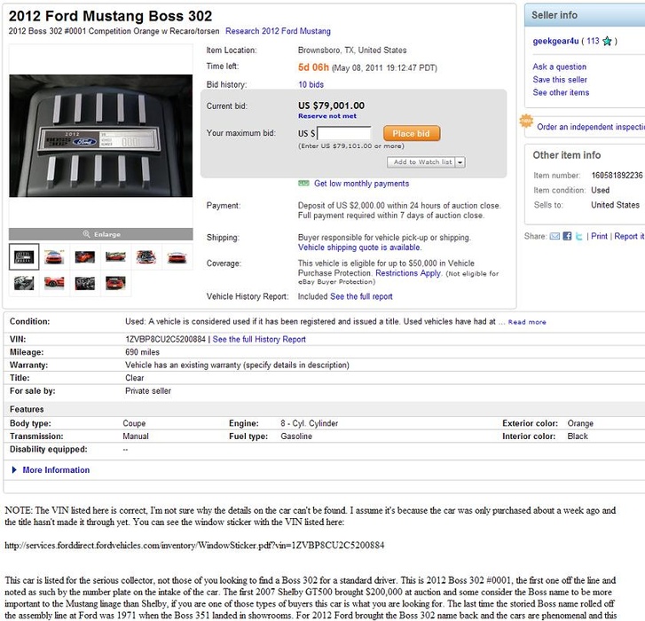 I don't need or really want to sell this car, but I don't have the space or desire to own a garage queen. I am entertaining local offers as well, so this auction could end early. If i keep it the car will be a daily driver carting my kids around, picking up groceries, burning up the race track on weekends and making the car show circuit. I bought a Boss 302, not an investment so if you want history, if you want an investment here is your chance. Since the story broke about how I came by this car the number of calls, emails, and texts I have received from people wanting to buy the car have been overwhelming. I want a Boss 302 that I can drive, mod, race, and cart my kids around in without having to worry that a door ding or dent is going to knock $30,000 off the future value of the car. Make no mistake, this is a highly sought after and very collectible car. If you want to read the stories yourself, Google 2012 Boss 302 #0001 and pick from any of the hundreds of links, stories, and talks about this car and what it will be worth in the future. You can check out one of the stories at the link below: