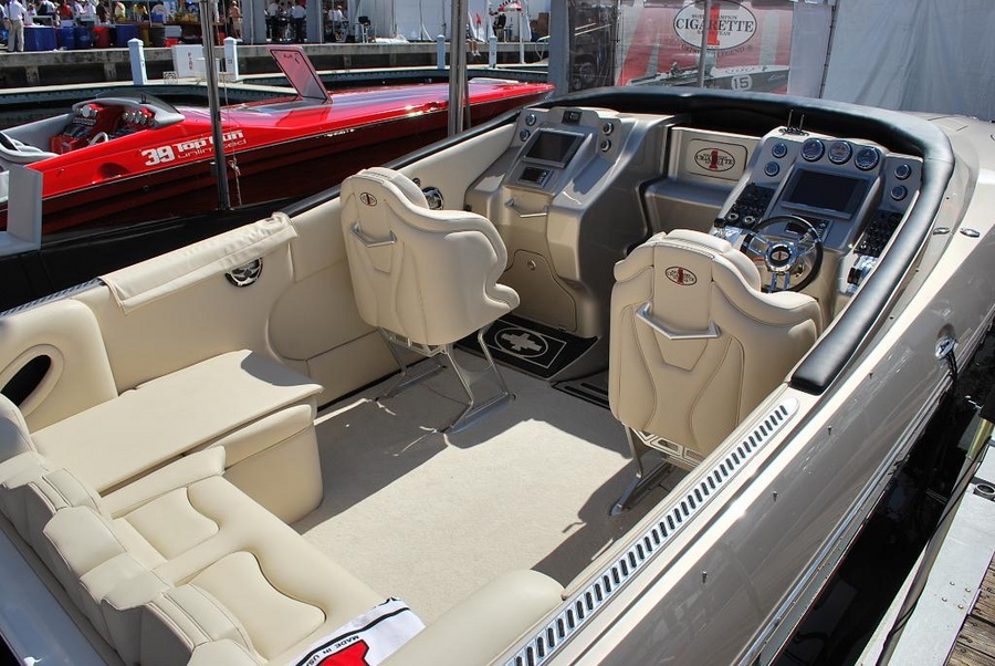 Nope, I would stick with outboards, probably triple 350 Verados. Then I would make a more comfortable U shaped rear bench that sat just a little lower. People can climb over it if they want get in the water. I would have it sit lower so that my passenger wouldn't feel like they were going to fly out of the boat. I know I did when I sat on that rear bench. I would have a larger top, that attached to the running boards and not the console, this way I have more room in the cockpit. Since I don't fish it wouldn't matter to me. I would also have a more useful rear facing center seat. For now that's it, however I would have to get on a new one and use it a couple of times before I came up with a serious list.