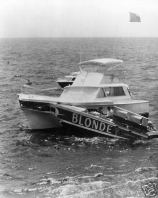 "They show the race boat Blonde IV in the race, and after it lost it's steering and smashed through the side of a Hatteras check point boat.