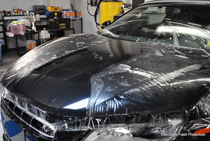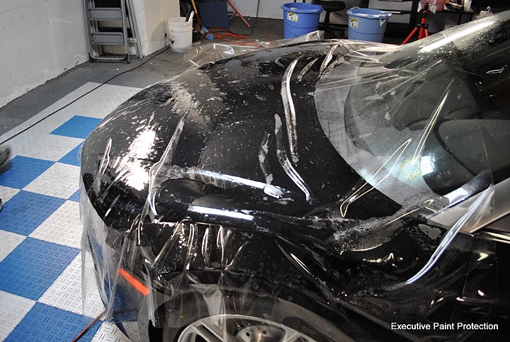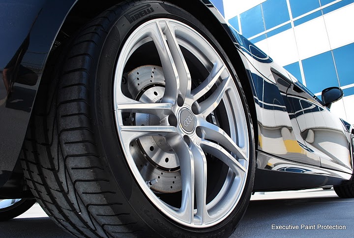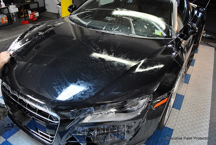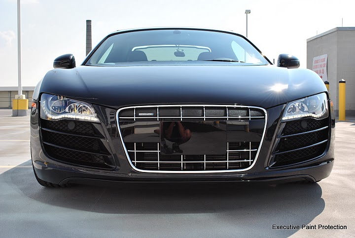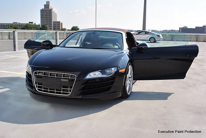 Well here is one of the few R8 V10’s in the US and we had the opportunity to work on this magnificent automobile for any amazing woman. The owner picked this car up from the dealer and drove it directly to our shop. The car when it arrived was not dealer prepped by our request as we like to get the vehicle cleaned to our standards prior to wrapping. For a new car the paint had some moderate scratches and swirls from delivery but we easily corrected those issues and did final prep for clear bra installation. This was by far the most challenging hood we have ever done. This was a single piece application with a hood width of over 95 inches making for a major job!! As you can see from the pictures we removed all the badges prior to installation giving this car an even tougher appearance. The front bumper was also custom wrapped and once finished was completely sealed and protected prior to heading south! Amazing car!!!