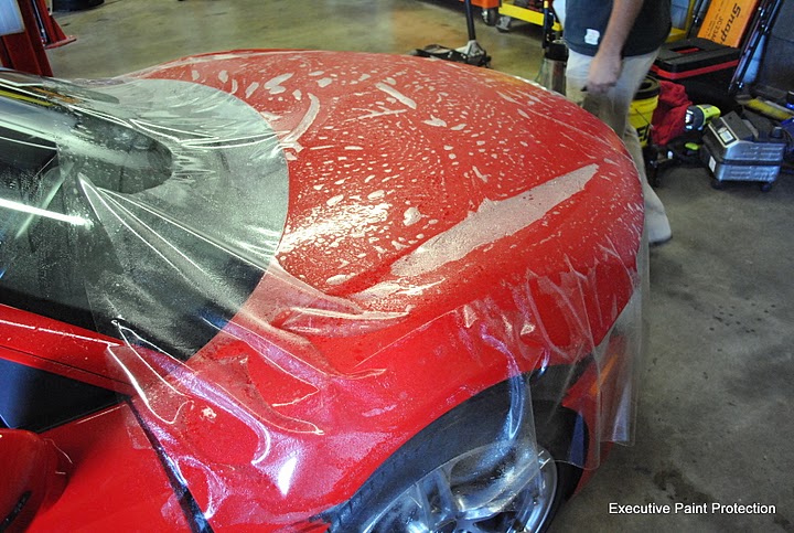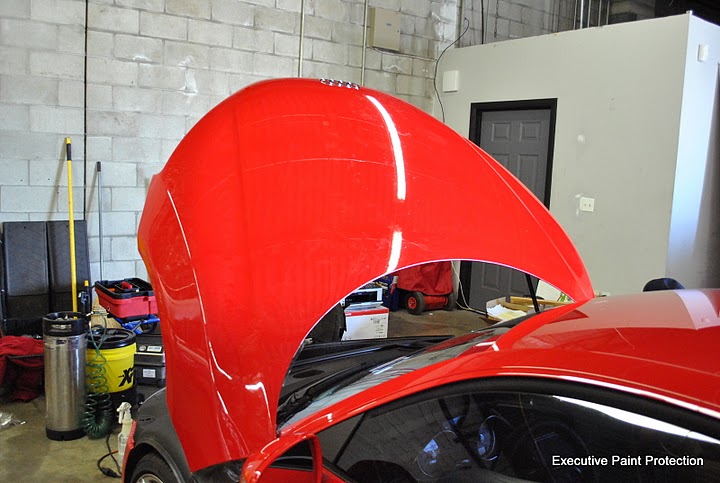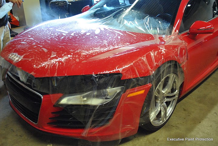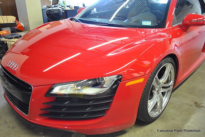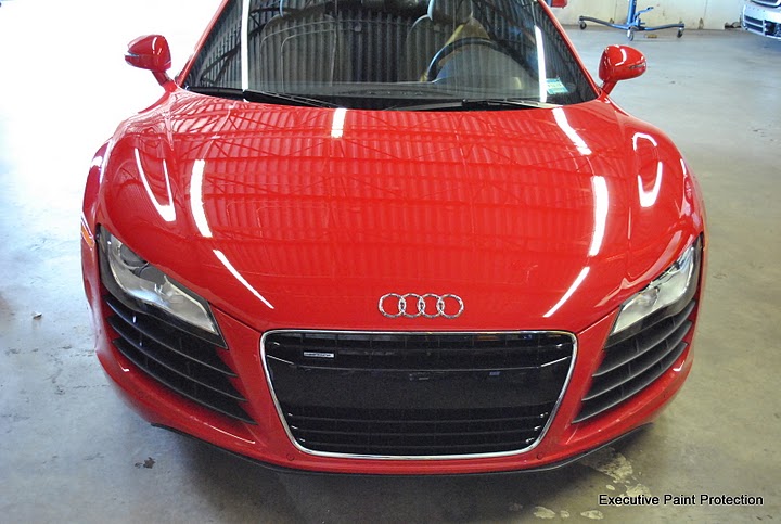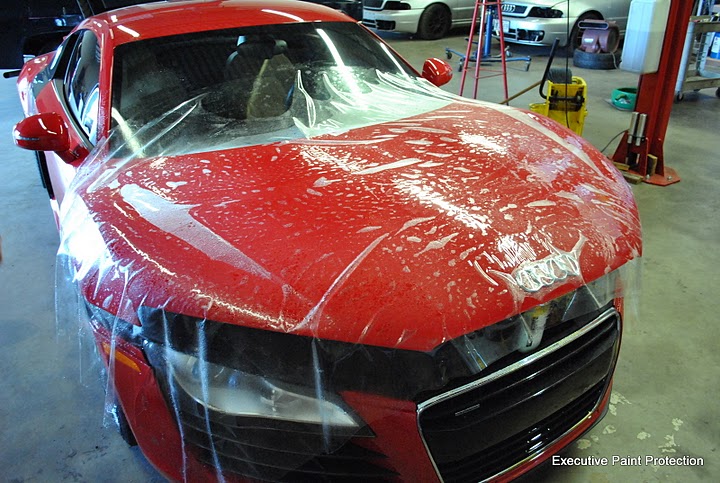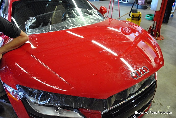 Here is a twin turbo Audi R8 that we recently replaced a three piece hood kit with a single piece application of CLEAR STEEL Protection Film Clear Bra. Here are some pics of the install and results. For more pictures of our work goto Executive Paint Protection: photo gallery