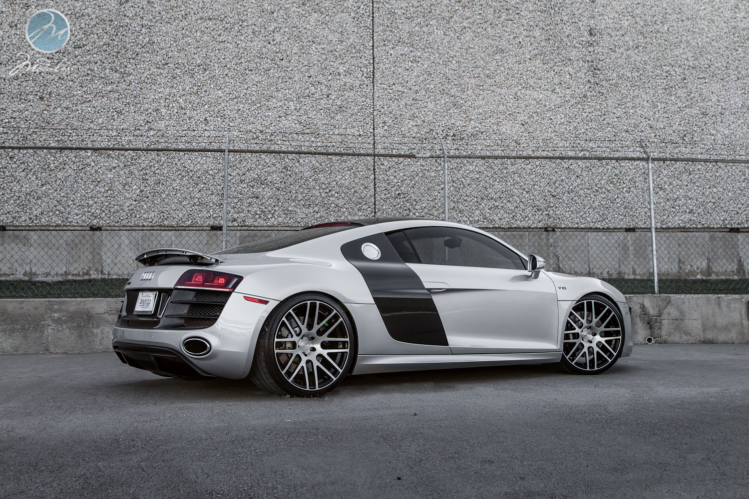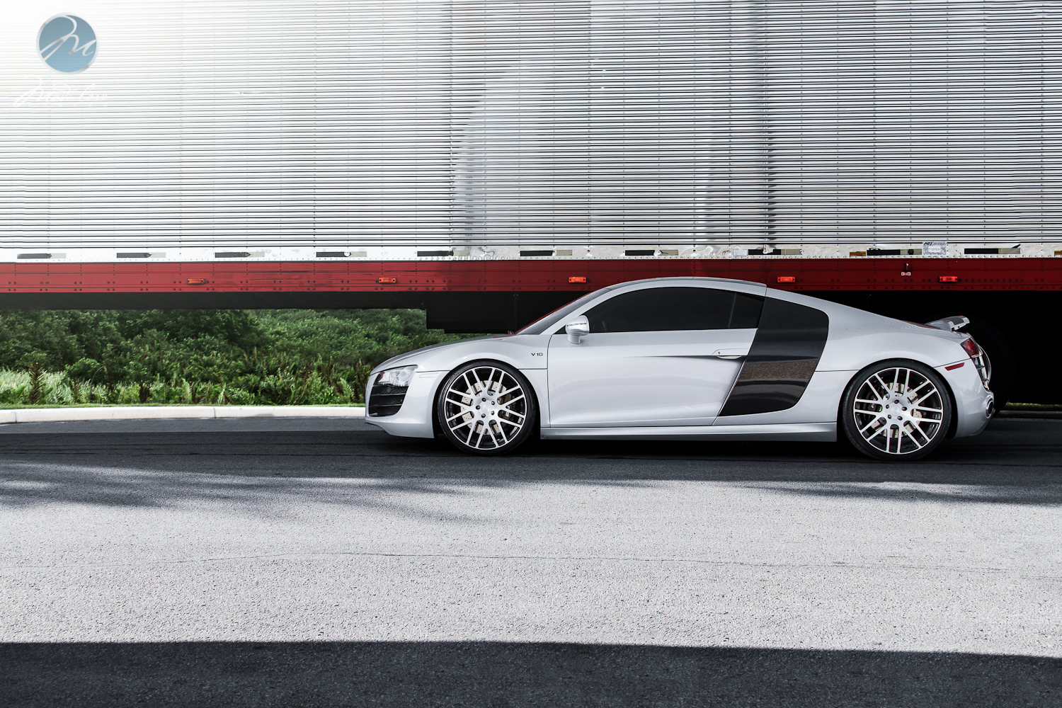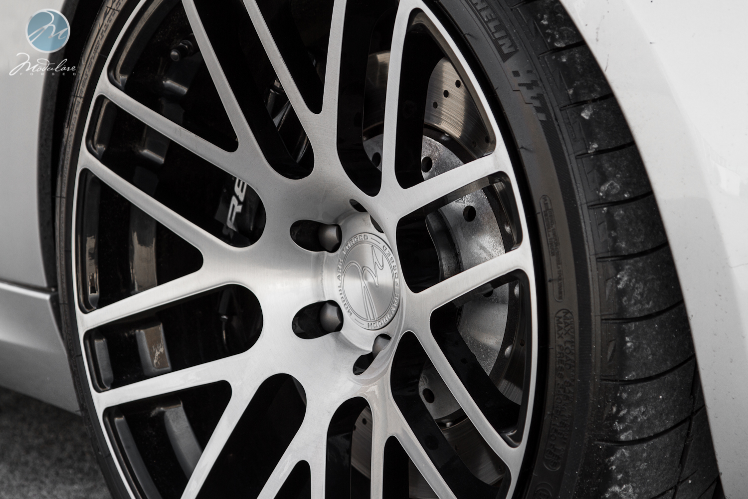 To start off 2013, here is a Audi R8 V10 coupe wearing a set of 20" Modulare B14 forged monoblock wheels in a special 2-tone brushed finish with gloss black windows. The wheels are 20x8.5 front and 20x12 rear, mated to Michelin PS2 245/30/20 and 325/25/20 tires.