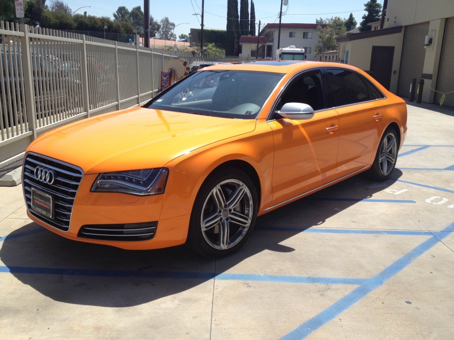 As I mentioned in my earlier thread, I decided to wrap my A8L in Bright Orange. Many were skeptical of this decision, which I must admit is a bit crazy. Well I think the car came out fantastic! Here is the first pic of the finished product. I'm going to pick the car up in about an hour and I'll post some more.