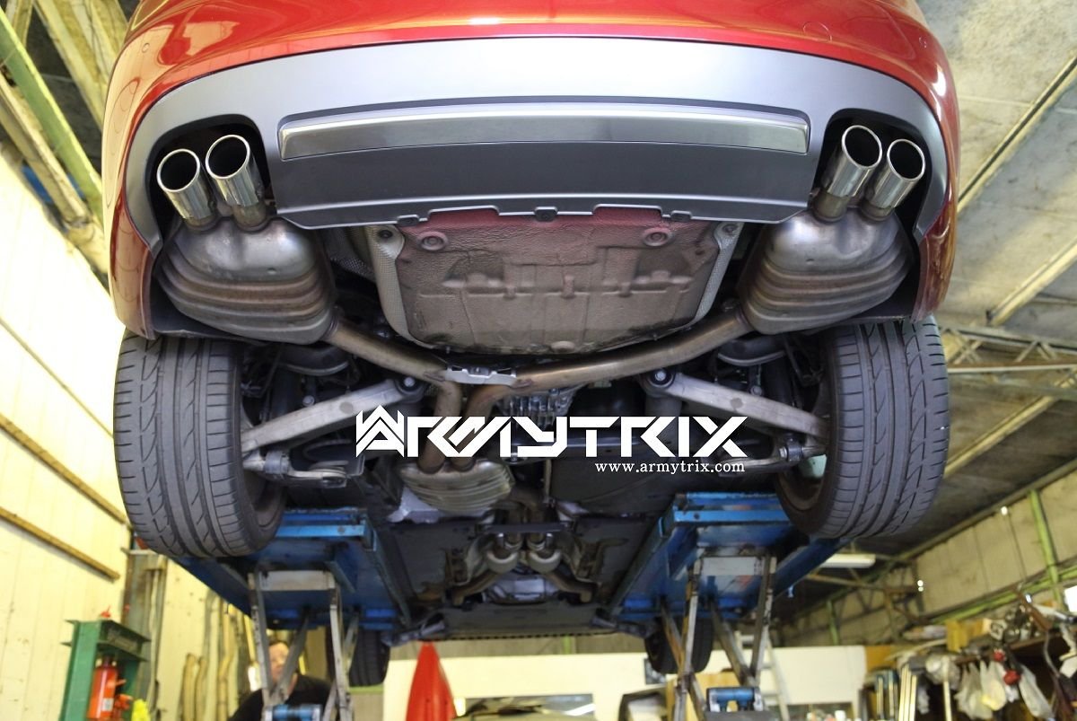 To enhance Audi S5 by adding the Armytrix stainless steel exhaust system to increase power, reduce weight, and improve sound. This precision-made performance system delivers more power, especially in the low and mid rev range, the effect on the sound is significant, adding a deep resonant sporty sound, but at the same time neutralizes the annoying frequencies in the most critical rpm range. Complete the look with a set of four sporty chrome polished silver tailpipes.