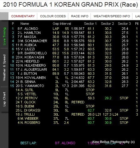 Good win by Alonso, although I am not happy he is leading the WDC. I must admit I would prefer one of the McLaren's to win the WDC than Alonso or Vettel. Webber still has a chance though!