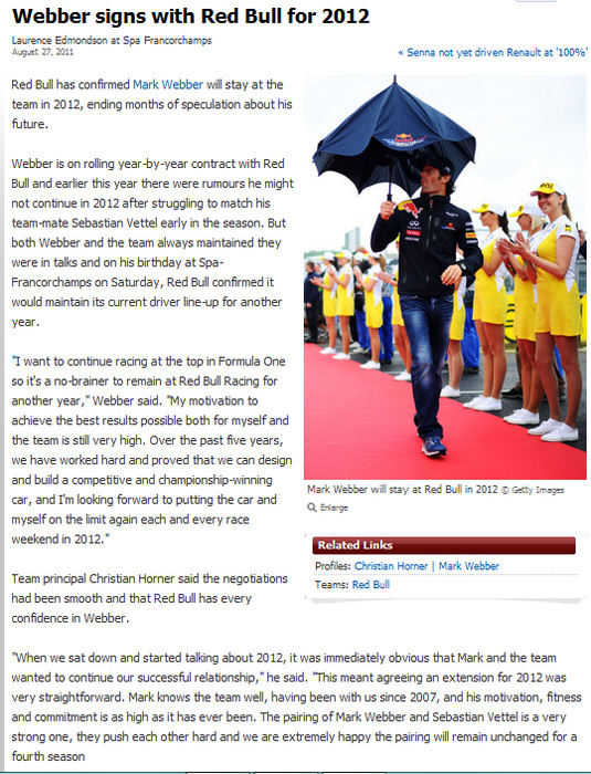 Mark Webber Signs With Red Bull Racing For 2012