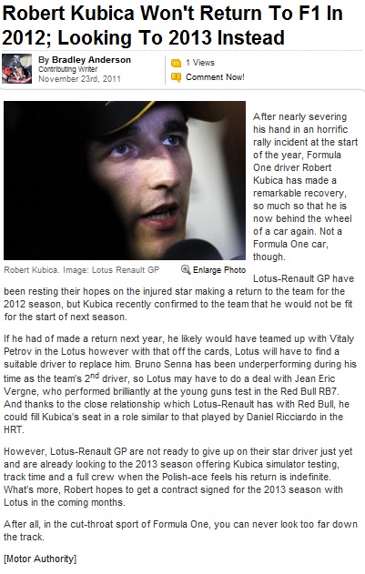 It seemed inevitable, but Kubica has reportadly confirmed to Lotus-Renault he won't be there for 2012. Original source: Motor Authority