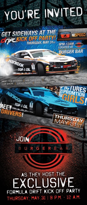Come out to the Formula Drift Kick Off Party powered by BizSpeed at 9:00 p.m. on Thursday May 31st at Burger Bar in Palm Beach Gardens! This party will be an exclusive opportunity to meet professional drifters and see the cars racing that weekend. No other professional racing series showcases drivers of the highest caliber combining extreme car-control driving and tire-smoking power. This is the hottest drifting event to hit South Florida and your chance to party with the drifters and grid girl models, win tickets to the races and tons of free swag. It will also be Ladies’ Night at Burger Bar- ladies can enjoy complimentary drinks and food.