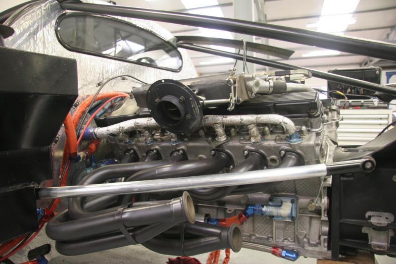 The engineering work was completed in Sept, when I took my first test drive on some damp Autumnal roads. Justin Law, the 4 times GFoS winner, was my guide for the day and first took me out as a passenger, to show me the ropes. Needless to say, he was able to extract the full level of performance from the car and leave me suitably impressed (or terrified, depending on your point of view). Then it was my turn. Sliding down into the cockpit (after first removing the steering wheel) and strapping in certainly adds to the sense of trepidation. The starting procedure is just like the group C cars - about an inch of throttle, flip the Ignition, Injector and Pump switches, then push the start button to get the V12 to catch then roar into life. The noise (there is no silencer) is simply epic. I was a bit nervous with the 6-speed dog box, but first is fairly easy to engage (although quite 'tall'). The three-plate clutch of course needs a bit of work and with no slipping allowed, you get off the line with a start. After that, you need to remember to make hard, positive changes going up (no clutch) - which is very satisfying - and just watch it on the way down. I tried double de-clutching coming down and got each gear most of the time. Without that, there is the occasional crunch, but this doesn't do any harm. Main thing to learn is getting it off the line cleanly. I had a couple of stalls as the clutch is quite fierce - but probably not as fierce as I thought it would be. Handling is excellent. Springs on mine are a bit too hard but the car really grips and is very light indeed. It only takes a smidgen on the wheel to change direction; gearbox requires only small movements, pedals nicely arranged although a bit cramped for my size 11s. No servo on the brakes which at first makes them feel 'dead' but after a while, you are reminded of just how wonderfully progressive non-servo brakes are. On a damp road, I felt very confident with the overall package. Best feature - which I save to last - is the engine. Torque from low down is phenomenal. We had the car dyno'd and it is fully blueprinted, delivering exactly 450BHP. There is a really direct feel between the pedal and engine output which makes it easy to drive in any gear with phenomenal acceleration always on tap.