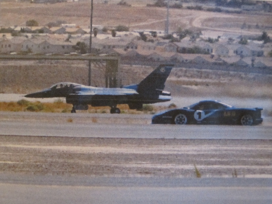 Finally, you may be wondering what has the fighter pilot dream got to do with the XJR 15. Well, I think I have found the road going version of my boyhood dream. If you look at the car in profile, it has a bubble over the cockpit, and as the driver sits inside, the huge backend of the car is packed with power.... and as it would happen as I sat late one night searching the internet for information on my car and I found a picture of the Nr 1 XJR -15 lined up an a runway at Nellis Air Force Base ready to race an F-16 fighter jet. Fantastic or what!