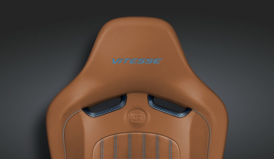 Interior. Carbon fiber is (along with stainless metals such as aluminum and magnesium) also the dominant material in the interior of the Vitesse. Numerous interior parts are now made from carbon fiber in the 1,200 hp roadster. This includes the center console extension, a cover with EB logo in the rear-bulkhead leather trim (between the seat backrests) and the belt outlet covers on the seats. The décor on the center console, the door inserts and the adjoining trim on the instrument panel are also made from carbon fiber. Contrasting stitching is also featured on the leather armrest between the seats, which comes without the typical quilting. Also new: knee pads in the center tunnel area, an additional 12 V socket (in the glove compartment), the restraint systems, the illuminated start and parking lock button (same as Super Sport), an instrument cluster with shift-up information and – as a matter of honor – the power gauge that now goes up to 1,200 hp.
