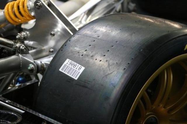 The Huayra's Power Lap tires carry no identifying branding other than "Pirelli" and sizes 265/645-19 and 325/705-20. This sizing nomenclature is specifically stated by Pirelli only for use on its track-only racing tires. This fact alone tells us exactly what the Power Lap tires are, and can be confirmed by the presence of slick tire treadwear dots in the exact same pattern as have Pirelli racing slicks. The fact that these size racing slicks are unique to the track-only Zonda R is doubtless not a coincidence.