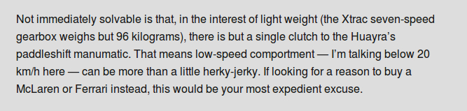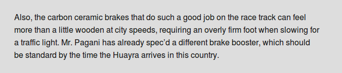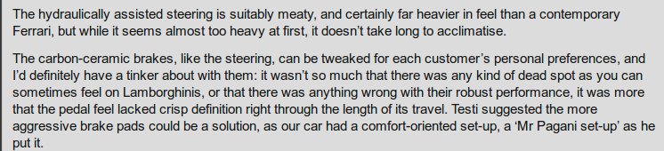 Just a question, what was your experience with the brakes of the Huayra when you drove it? I just flipped open the newest Road and Track and they wrote "the brakes are satanic, with no feel and ultrahigh effort." It was the only negative thing in the whole review and probably the first real negative thing I've read about the Huayra. Maybe some others can chime in if they know of other complaints/compliments on the brakes.