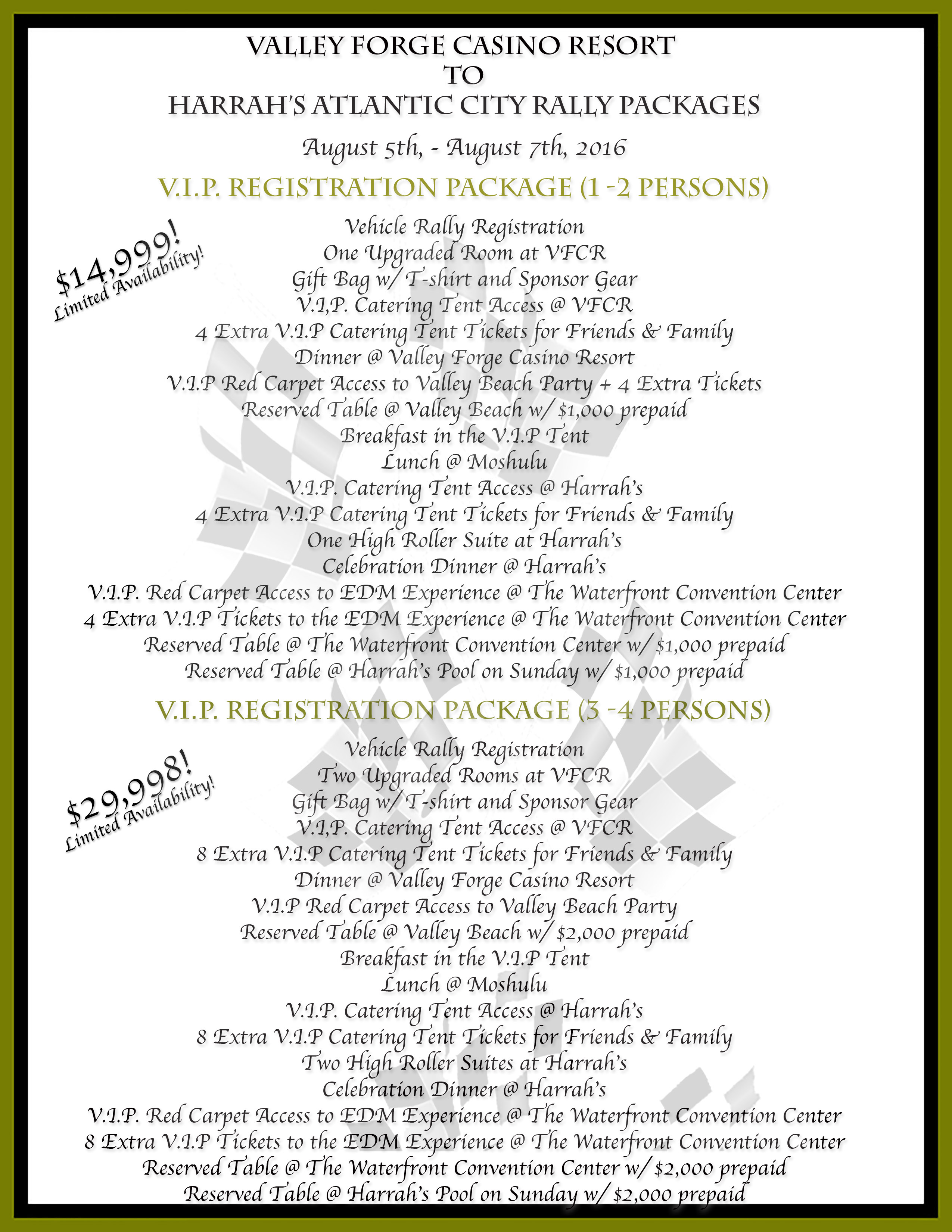 The 2016 Valley Forge Casino Resort to Harrah's Resort Atlantic City Exotic Car Exhibit & Rally will begin on Aug. 5th, 2016. Registration begins at 2pm at the Valley Forge Casino Resort parking lot. Guests will park their vehicles in a special showcase parking lot. Rallies will stop by the registration booth to get their t-shirts, hats, gift bags with sponsor merchandise and lanyard ID's.
