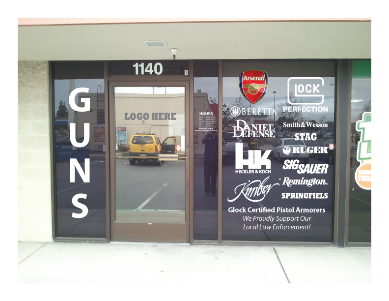 I would also suggest a roll down garage style security door inside or out. The most popular way to get free guns is by way of crashing stolen truck into unprotected glass.