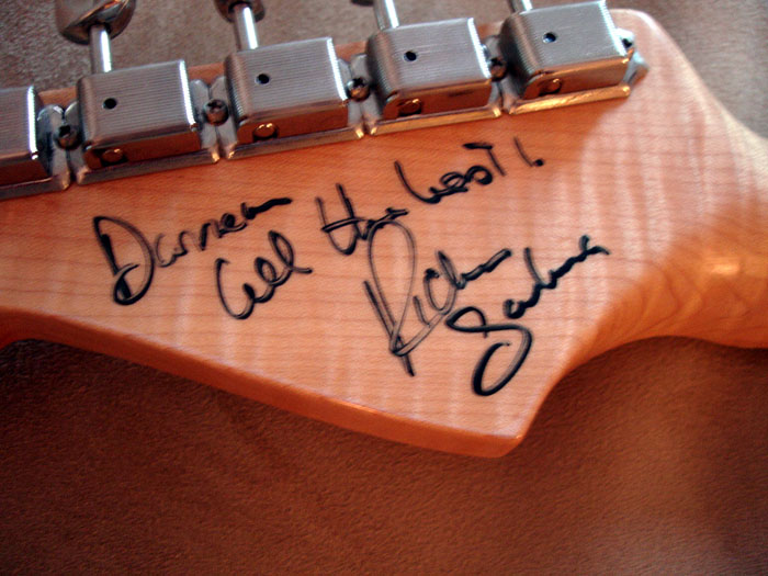 My friend Todd Krause who is a master builder at the fender custom shop made me a few custom shops as he did for Richie hooked this up for me. Richie is super cool met him a bunch of times, greta guy. Todd actually sent him the neck while he was building it knowing it would arrive to me around my birthday for him to sign, it was an awesome surprise!