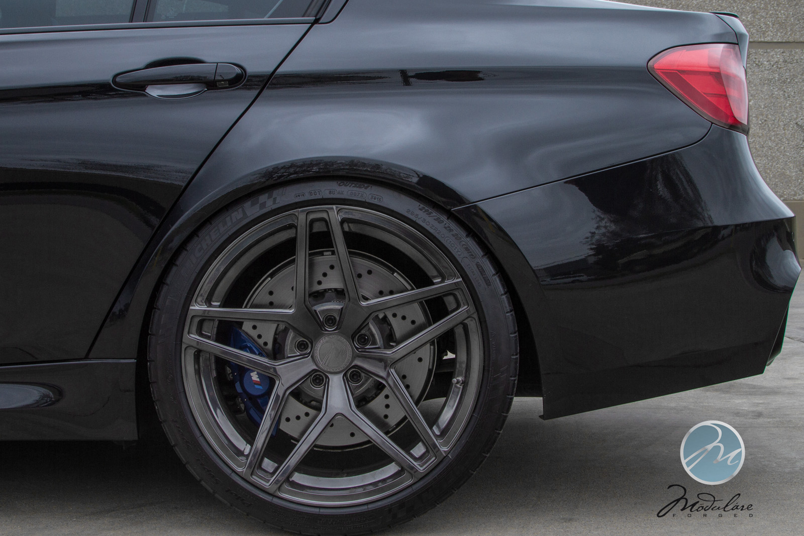 Shown here on this 2015 BMW F80 M3 in sizes 20x9.5 front and 20x11 rear, the Modulare B32 is now available for ordering in sizes 19-22” for most 5-lug passenger car and light truck applications. In addition, we are debuting a new Liquid Smoke finish, which is now available for ordering on any Modulare Forged product. The appearance of Liquid Smoke is to emulate that of Black Chrome, but in a powdercoated finish, to eliminate all the headaches normally associated with a traditional Black Chrome finish. Liquid Smoke can be applied over a brushed base or polished base (as shown here), depending on the wishes of the end customer.
