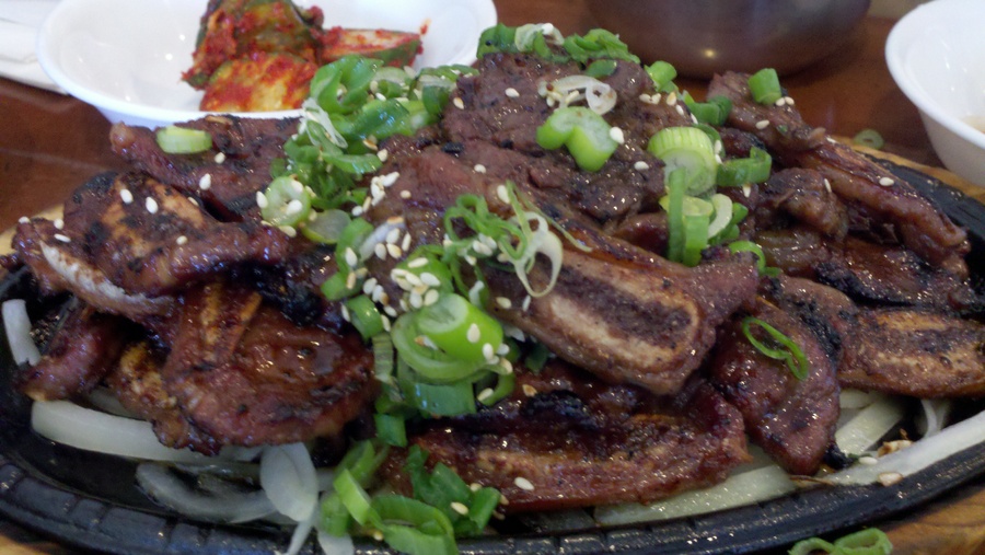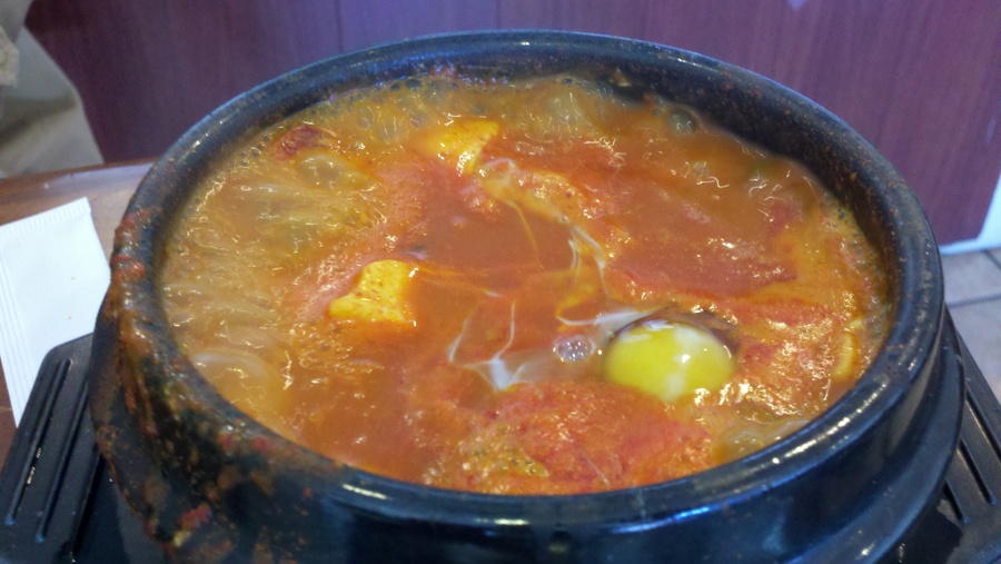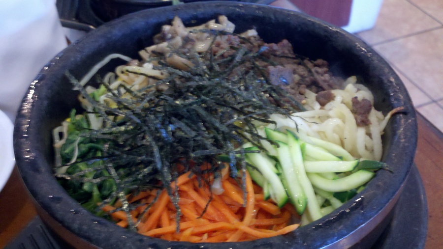 The classic dishes, bibimbap extra spicy, seafood soon tofu extra spicy, and bugogi.