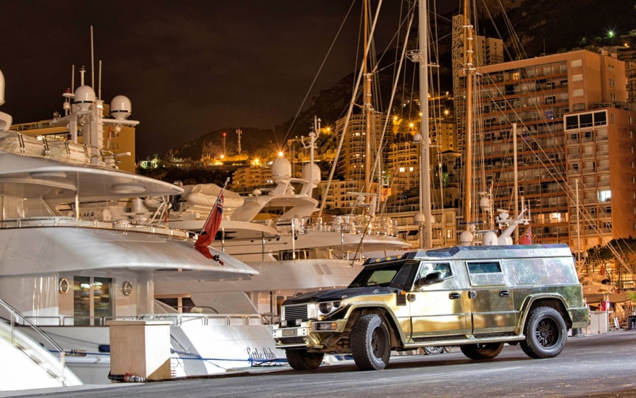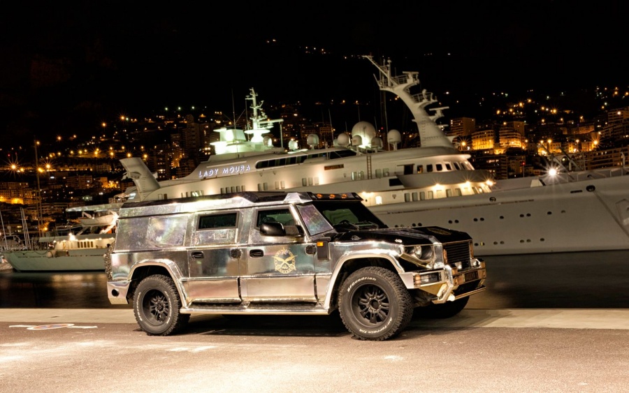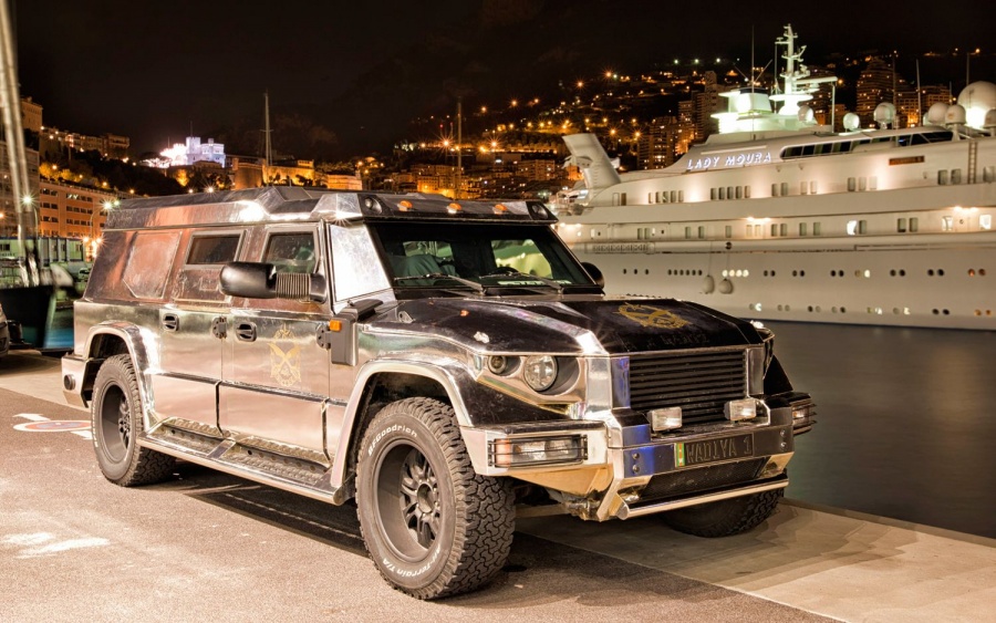 * The Dartz Prombron Monaco Red Diamond Edition was shown at the 2010 Top Marques in Monaco, with an expected price of €1,000,000 ($1.25 million), it would become the world's most expensive SUV ever sold. Features included white gold - ruby embedded badges as well as a gold-plated, bullet-proof windows, an exhaust system made out of tungsten, diamond - ruby encrusted gauges, a Kevlar exterior coating, and leather made out of whale penises, although the latter was dropped. The Prombron Monaco Red Diamond Edition also comes with three bottles of the world's most expensive vodka, RussoBaltique.