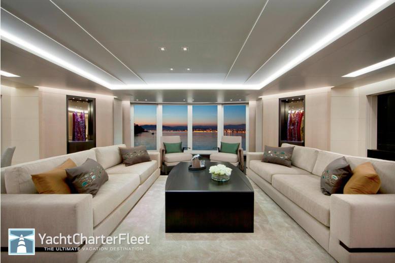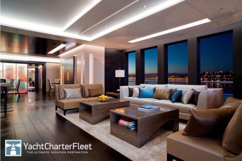 Mogambo’s forward-most profile shows a few key design elements. First, note the large ports along her side. The biggest ones are floor to ceiling, situated in the master suite. Similarly large windows are back aft (not visible), in the dining area and saloon. Also note the PWCs stowed on deck, just forward of a sunpad. Most yacht buyers would want this area solely for relaxation and have all toys kept in a garage, but Mogambo’s owner had different ideas. Recall the large ports just mentioned—you can see just how dramatic an effect they have here in Mogambo’s saloon. Equally dramatic is the decor, with ebonized walnut flooring and sycamore wood paneling. If you look toward the right part of the photo, you’ll see the dining area, unusually not separated from the saloon. Interesting enough, as comfortably laid out as the saloon is, Mogambo’s owner reportedly likes to use the upper-deck lounge more.