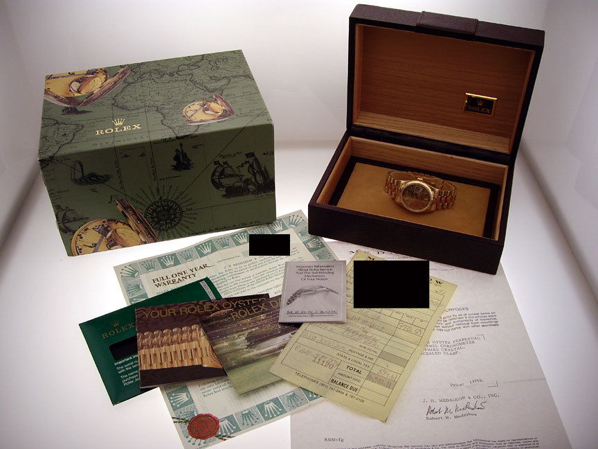 Rolex Day-Date President (Ref: 18238) (SN: L252xxx - circa 1989). Beautiful original PERFECT Champagne Stick Dial, Excellent Sapphire Crystal, Unpolished Case. President 8385 Bracelet, Very Tight, 21 Links (fits 7.5" wrist), Unpolished. Watch comes with complete Inner/Outer Box, the Original Rolex Chronometer Papers (dated 4/12/91), Original first Sale Receipt (also dated 4/12/91), Green paperowrk sleeve, "Your Rolex Oyster" and "Rolex Day-Date" Booklets, as well as a small fold-out booklet and appraisal from the first selling jeweler (also date 4/12/91).