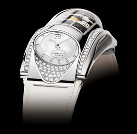 The watch has now been updated with a new special edition range designed exclusively for the Veyron Fbg par Hermes model. The watch is available in several color combinations including a brushed white-gold model with a brown dial or a rose gold model and a coffee brown dial. The version pictured here is fitted with a mother of pearl face and diamond highlights.